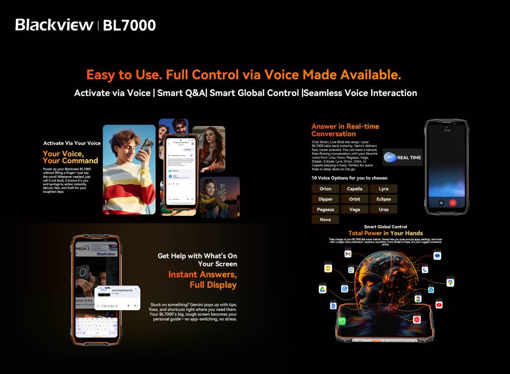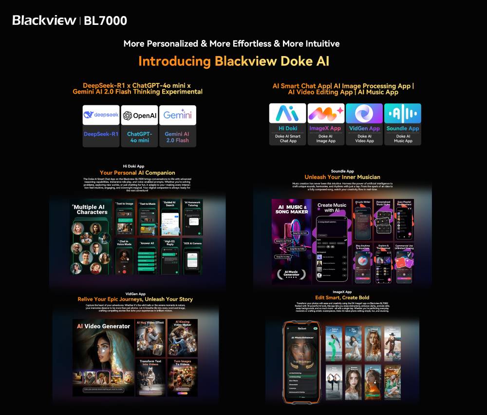 A Blackview BL7000 a Doke AI 2.0 operációs rendszert futtatja, amelybe integrálták a DeepSeek-R1, a GPT-4o mini és a Gemini 2.0 Flash Thinking Experimental mesterséges intelligencia modelleket. A szoftver funkciói közé tartozik a biztonságos hangalapú feloldás, az applikációk hangutasításokkal történő vezérlése, illetve intelligens, kontextusfüggő üzenetválaszokat kaphatunk kérdéseinkre. A Doke AI 2.0 rendszert úgy tervezték, hogy megértse a felhasználói szándékot és intelligensen egyszerűsítse a mindennapi feladatokat.