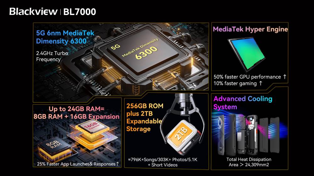A Blackview BL7000 belsejében 6 nm-es MediaTek Dimensity 6300 lapkakészlet teljesít szolgálatot. A fejlett chipsetet 12 GB fizikai, illetve ha igénybe vesszük a virtuális bővítés lehetőségét további 12 GB virtuális RAM egészíti ki. A háttértár kapacitása 256 GB, amelyet micro SD kártyával akár további 2 TB-tal bővíthetünk.