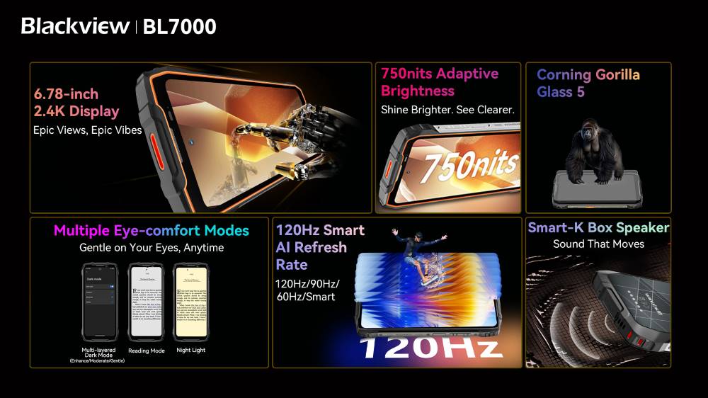 A Blackview BL7000 előlapját egy 6,78 hüvelykes, Full HD+ felbontású megjelenítő foglalja el, amely 750 nites maximális fényerőt és 120 Hz-es képfrissítési rátát kínál. A Glove Mode 2.0-nak köszönhetően az okostelefont kesztyűs kézzel is vezérelhetjük. A fizikai behatások, karcok és ütések elleni védelmet Corning Gorilla Glass 5 üvegbevonat biztosítja.