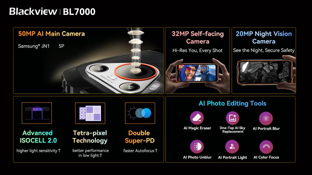 A Blackview BL7000 négy exkluzív mesterséges intelligencia applikációval érkezik: A Hi Doki egy nagyon okos hangasszisztens; az ImageX AI segítségével fejlett képszerkesztési lehetőségeket vehetünk igénybe; a VidGen a videós tartalmak készítését egyszerűsíti; a Soundle pedig a zenei ötletek megvalósításának lehet kiváló eszköze.