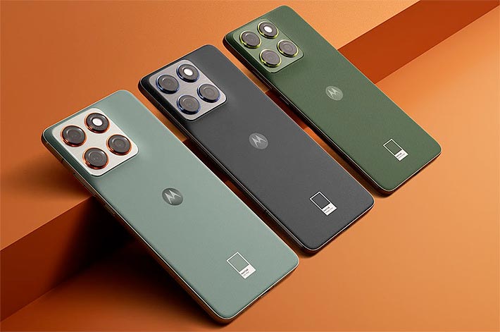 A hátlap egyedi, nejlon textúrájú kialakítást kapott. A Motorola Edge 70 jól bírja a gyűrődést, ezt igazolja a MIL-STD-810H katonai szabvány megléte is. Az Edge 70 három árnyalatban kerül forgalomba, ezek mind Pantone által érvényesített színek. Az érdeklődők szürke, és kétféle zöld kivitel közül választhatnak.