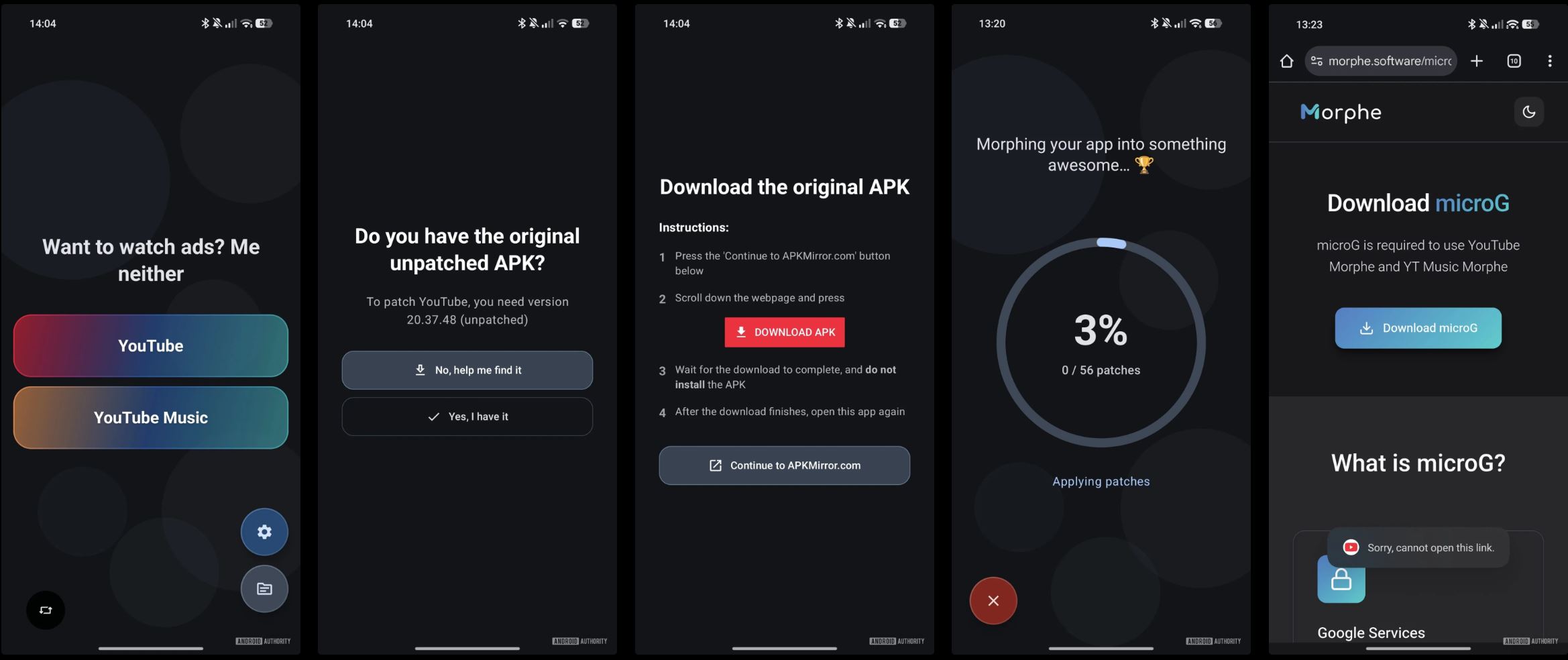 A Morphe használata egyszerű, szinte adja magát. Letöltés után kiválaszthatjuk a patchelni kívánt alkalmazást, majd a rendszer bekéri az eredeti, módosítatlan APK-fájlt – jelenleg a YouTube v20.37.48-as verziójára van szükség, ehhez a Morphe közvetlen linket is biztosít az APKMirror oldalára. A patchelési folyamat végeztével telepíteni kell a módosított appot, valamint az első indításkor a microG keretrendszert; ez ugye ahhoz kell, hogy be tudjunk jelentkezni a Google-fiókba.