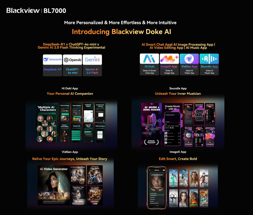 A Blackview BL7000 egyik központi eleme maga a szoftver, vagyis a Doke AI, amelyet három vezető mesterséges intelligencia modell, a DeepSeek-R1, a GPT-4o mini és a Gemini 2.0 Flash Thinking Experimental integrációjával vérteztek fel.
