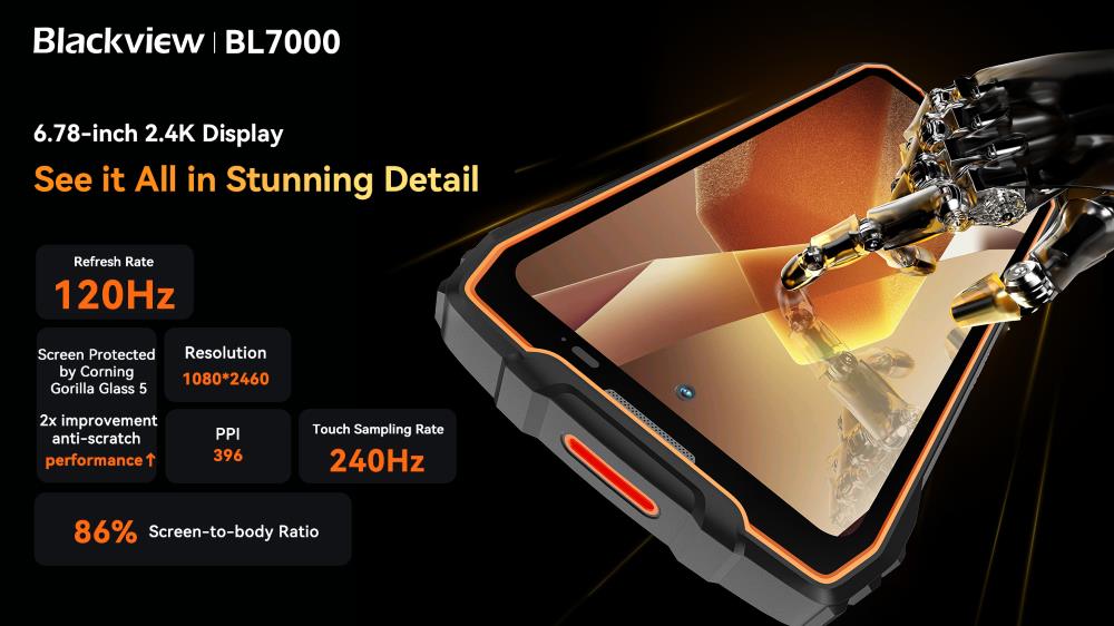 A Blackview BL7000 6,78 hüvelykes, Full HD+ felbontású megjelenítővel rendelkezik, amelynek maximális képfrissítése 120 Hz. A panel 750 maximálisan nites adaptív fényerőt, fejlett szemkímélő módokat és egy továbbfejlesztett kesztyűs módot (Glove Mode 2.0) is biztosít, amivel nedves ujjakkal vagy kesztyűn keresztül is vezérelhetővé válik a felhasználói felület.