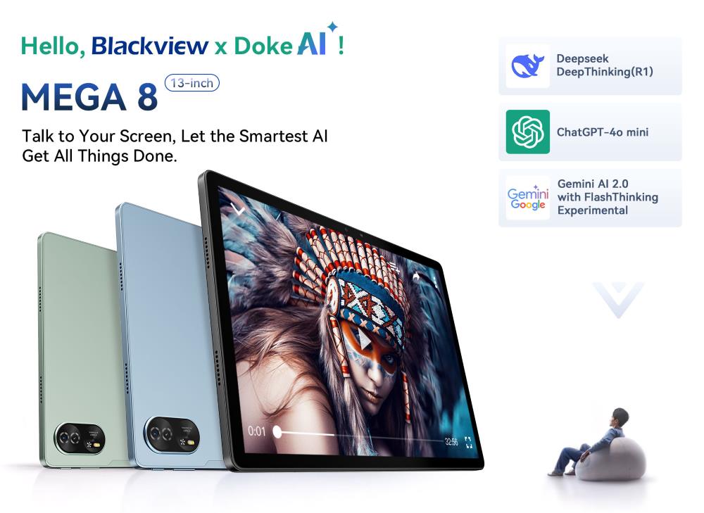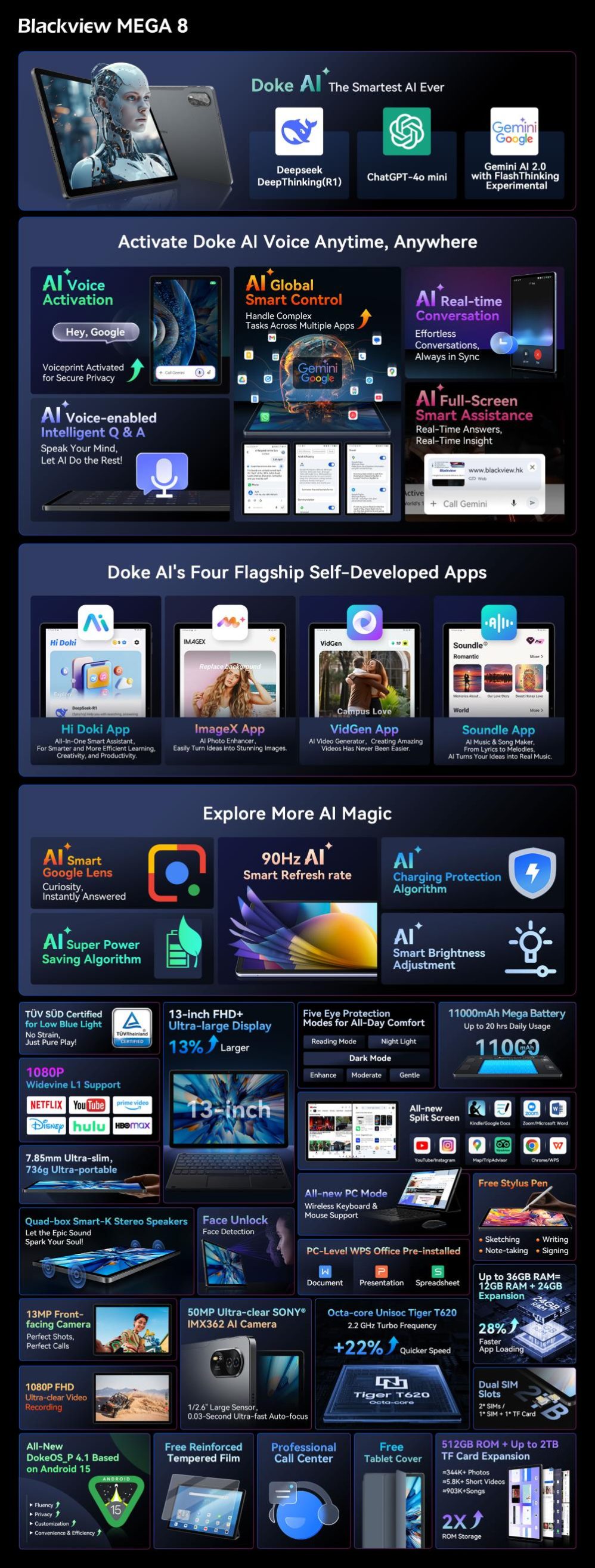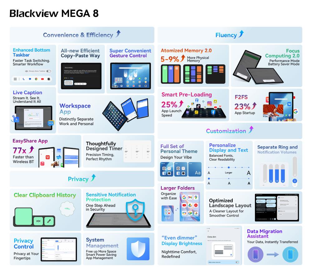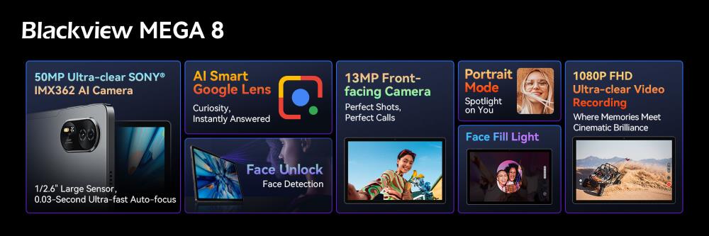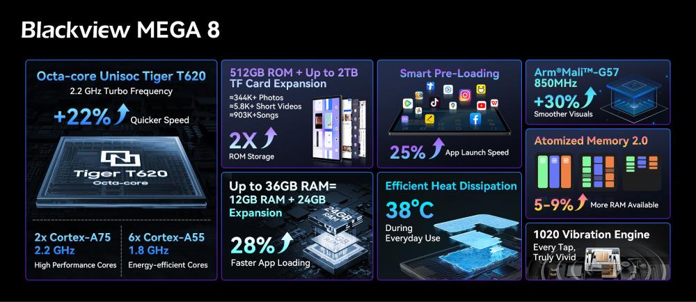A Blackview MEGA 8 egy 13 hüvelykes, Full HD+ felbontású megjelenítővel, 11 000 mAh kapacitású akkumulátorral és Unisoc Tiger T620 chipsettel szerelt, mesterséges intelligencia funkciókkal felvértezett táblagép. A készülék akár 36 GB RAM-mal is szolgálhatja új tulajdonosát (ebből 12 GB hardveres, 24 GB virtuális), a belső tárhely pedig 512 GB-os, de ez tovább bővíthető egy akár 2 TB kapacitású microSD kártyával.