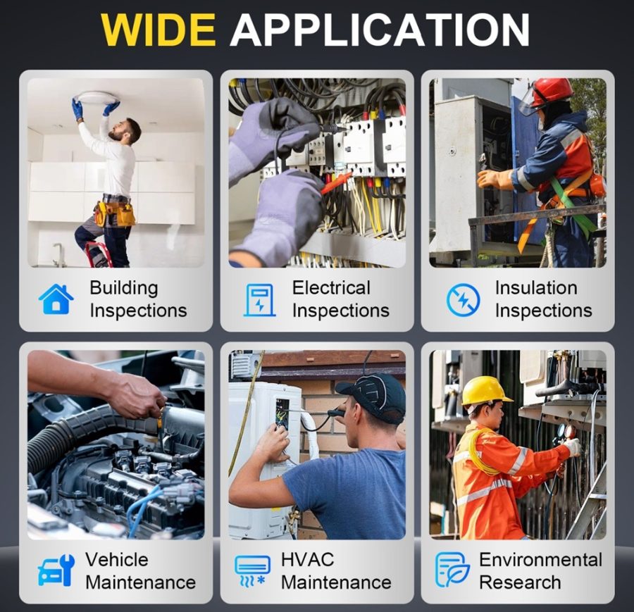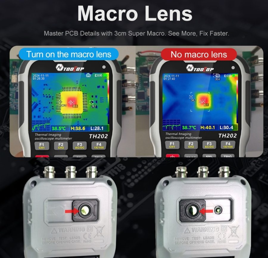 A mellékelt makrólencse különösen hasznos elektronikai alkalmazások esetén, mivel lehetővé teszi, hogy kis távolságból részletgazdag hőképek készüljenek. Ez elősegíti például a túlmelegedő SMD-alkatrészek gyors azonosítását. A készülék szoftvere több színpalettát kínál, valamint konfigurálható hőmérsékleti riasztási funkcióval is rendelkezik.