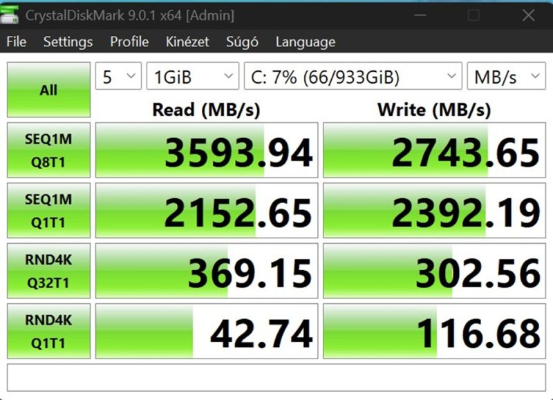 A processzor mellé 16 GB DDR4 RAM és egy villámgyors, 1 TB-os NVMe SSD társul. Utóbbi a CrystalDiskMark tesztben lenyűgöző, 3593 MB/s-os szekvenciális olvasási sebességet produkált, ami garantálja a rendszer és az alkalmazások gyors betöltését.