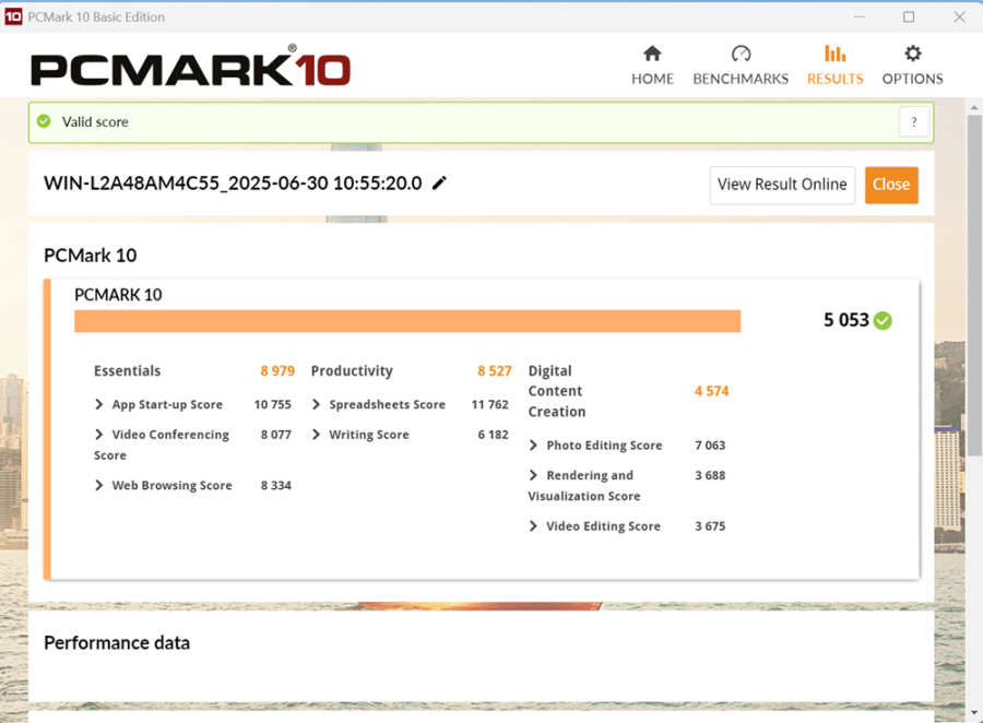 - PCMark 10 összesített pontszáma: 5053 pont. Ez egy erős átlagos eredmény, ami azt jelzi, hogy a gép jól teljesít az általános irodai és multimédiás feladatokban.