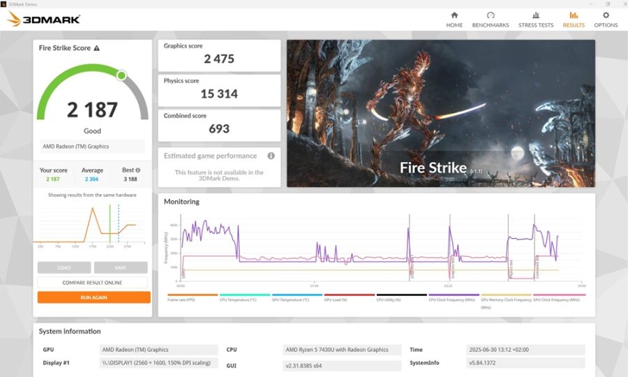 - 3DMark Fire Strike benchmarkban: 2187 pontot ért el. Ez az eredmény azt jelzi, hogy a gép az integrált grafikus vezérlő ellenére alkalmas lehet könnyedebb játékokra, vagy régebbi címek futtatására alacsonyabb beállításokkal.