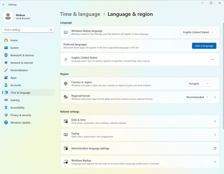 A készülék első bekapcsolásakor a Windows 11 Pro konfigurációs varázslóján keresztül beállítjuk a nyelvválasztást, az Ethernet vagy WiFi hálózati kapcsolatot, majd hozzáférünk a Windows 11 Pro asztalhoz. A rendszer aktiválva van, az illesztőprogramjai megfelelően telepítve, készen állnak a munkára. Töltsük le a magyar nyelvi csomagot, majd futtassuk a Windows Update szolgáltatást a frissítéshez.