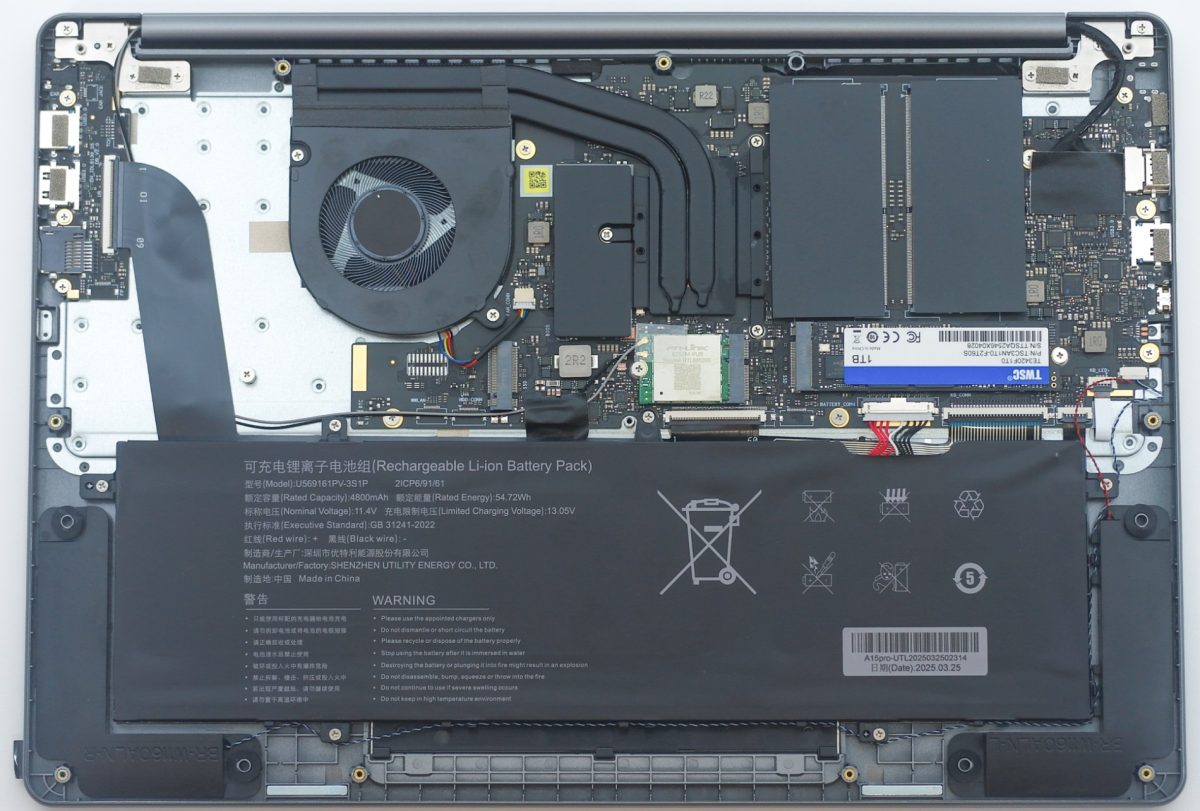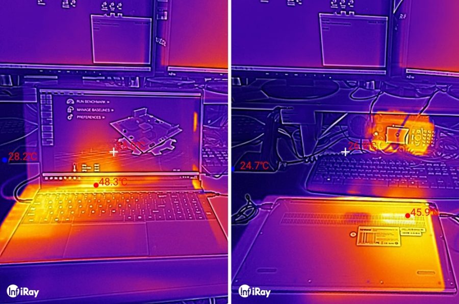A használat során a laptop csendes és hűvös marad. A hűtőrendszer egyetlen ventilátorból és két réz hőcsőből áll. A levegőt alulról szívja be, a meleg levegőt pedig ötletesen a zsanér mögött, a kijelző felé fújja ki. Normál irodai használat közben a ventilátor alig hallható. Intenzív terhelés alatt (pl. renderelés vagy játék) a hangja felerősödik, de sosem válik zavaróvá, a billentyűzet közepe pedig langyossá válhat, de a rendszer még extrém terhelés alatt is képes elkerülni a komolyabb teljesítménycsökkenést (throttling).