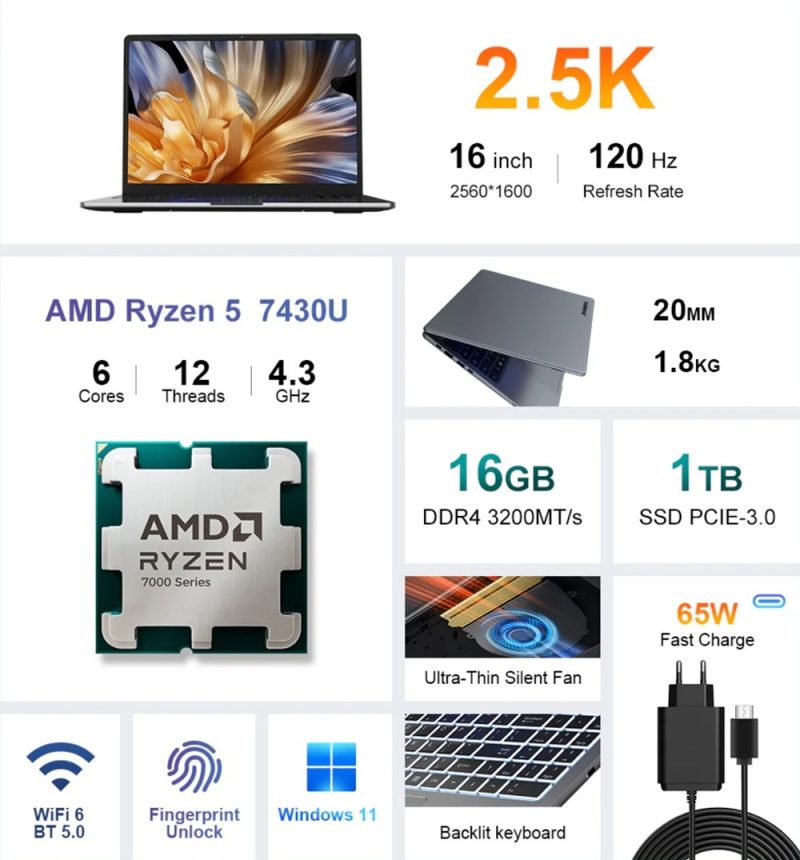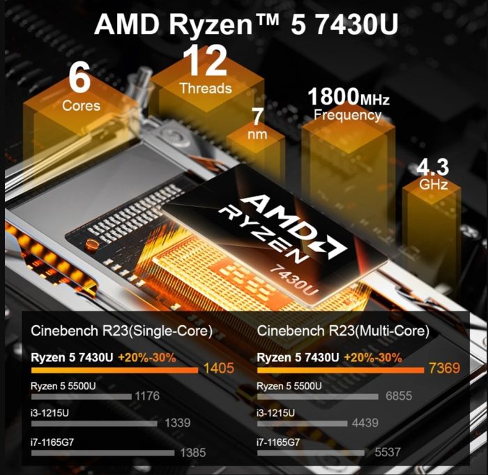 | CPU | AMD Ryzen 5 7430U, 6 maggal és 12 szállal, maximális 4,3 GHz-es frekvenciával |
