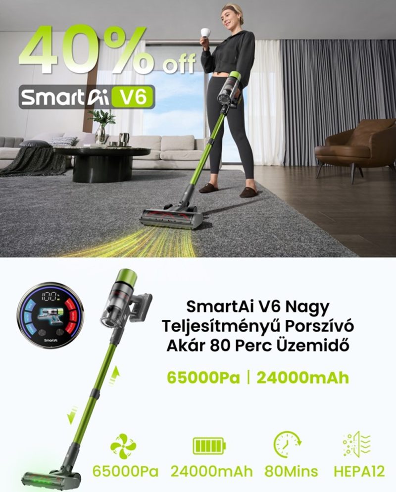 A bemutatást egy olyan eszközzel kezdjük, amely az utóbbi időben az egyik legnépszerűbb választássá vált a hatékony, ugyanakkor megfizethető takarítást keresők körében. A SmartAI V6 robotporszívóról korábban már részletesen is beszámoltunk: ez az a készülék, amely a prémium márkák szívóerejét és intelligens funkcióit kínálja, miközben az ára jóval kedvezőbb maradt. A készülék azóta is kiválóan teljesít a felhasználók körében, így ha valaki megbízható eszközt keres az otthoni rend fenntartásához, érdemes számításba vennie.
