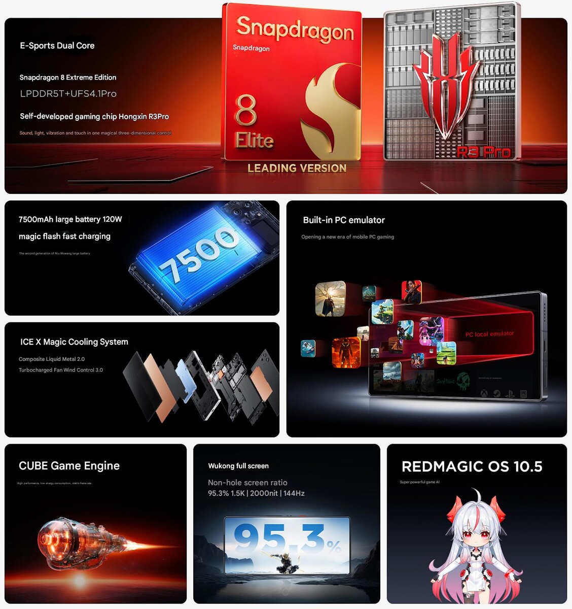 A hardver részét képezi még a RedCore R3 Pro dedikált gaming chip, amely a játékok folyamatos futtatását igyekszik elősegíteni. A már említett, túlhúzott hardveres platform mellé akár 24 GB LPDDR5T memória, illetve legfeljebb 1 TB UFS 4.1 Pro háttértár kerülhet az összeszerelés során. A működés közben keletkező hőt az ICE-X nevű hűtőrendszer igyekszik féken tartani, amely folyékony fémet és ventilátort is bevet az ügy érdekében.