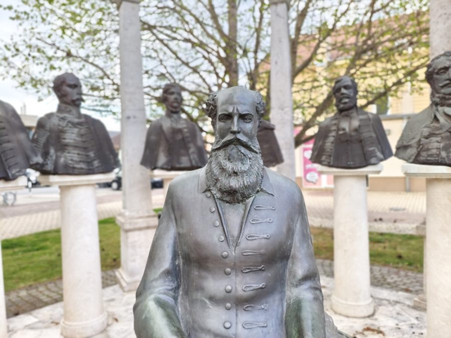 A főkamera nappal meggyőző. A bokeh módban készült szobros képen jól látszik, hogy az élesség-mélység kezelés természetes: az előtéri bronzszobor szakállának és kabátgombjainak apró részletei tisztán kivehetők, a háttér pedig fokozatosan mosódik el, nem hirtelen vágódik ketté a kép.