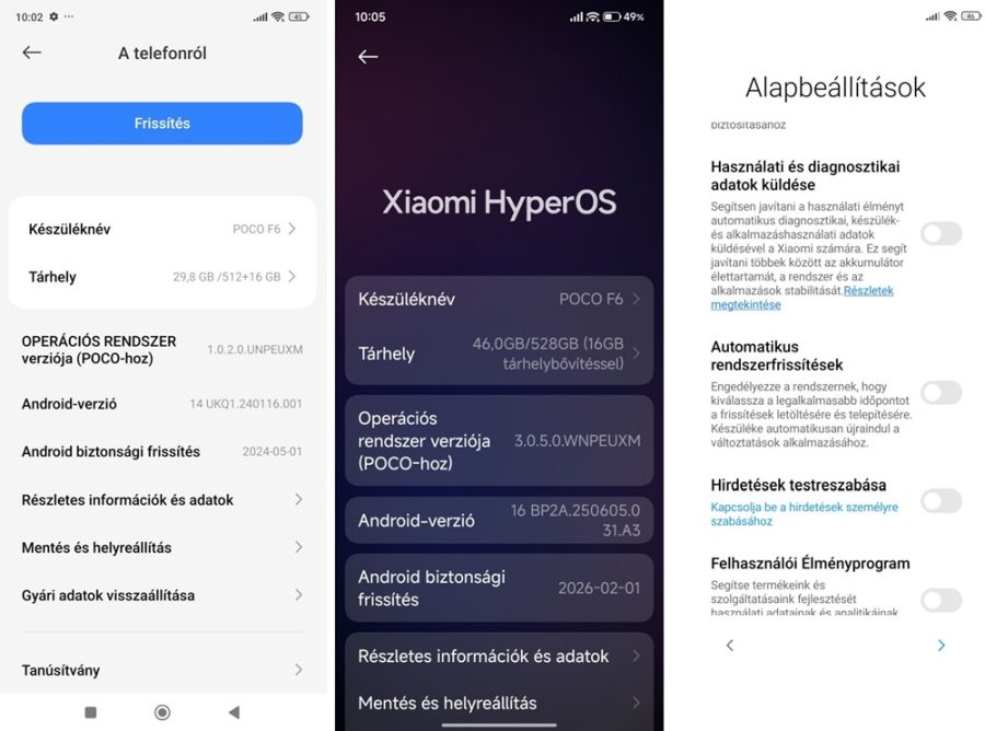 A tesztpéldány HyperOS 1.0.2.0-val és Android 14-gyel érkezett, az első frissítés viszont azonnal felkínálta a HyperOS 3.0.5.0-t, amely már Android 16 alapokra épül, 2026. februári biztonsági csomaggal. Ez a tempó figyelemre méltó: az Android 16 jóval azelőtt megérkezett az F6-ra, hogy több drágább konkurens egyáltalán megkapta volna.