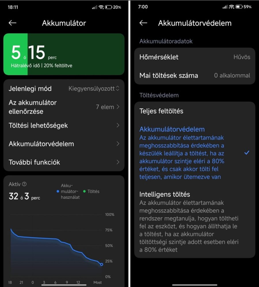 Az 5000 mAh-s akkumulátor vegyes, mindennapi használat mellett kényelmesen hozza a kétnapos üzemidőt. A saját mérésünk során 32 óra 3 perc használat után még 20%-on állt a készülék, a rendszer pedig további 5 óra 15 percet becsült – ez kifejezetten erős eredmény.