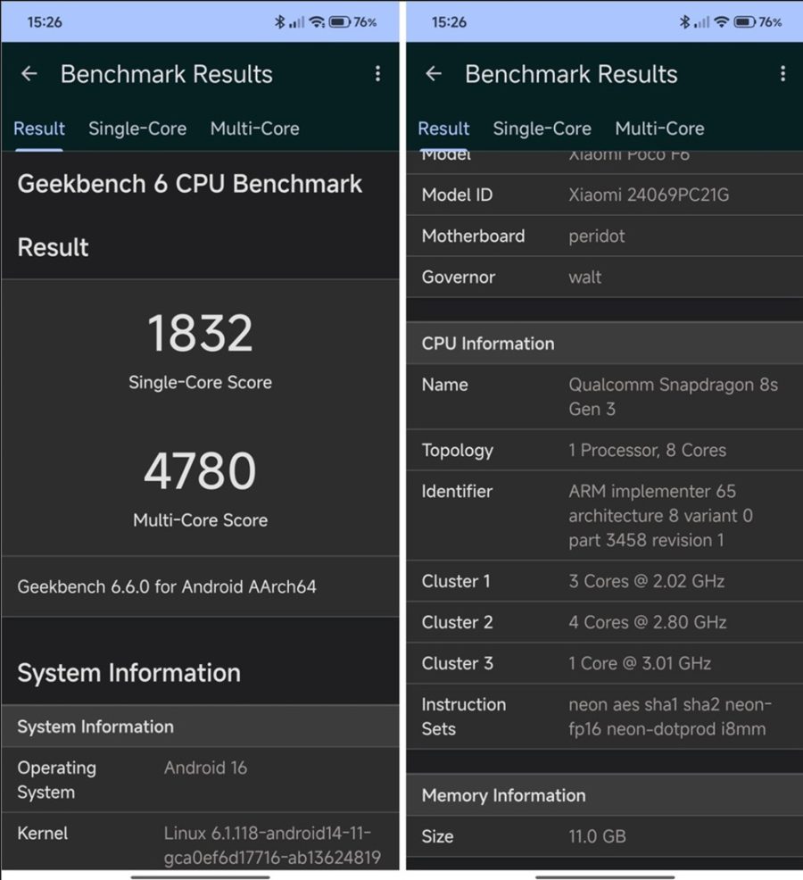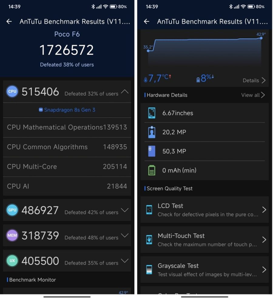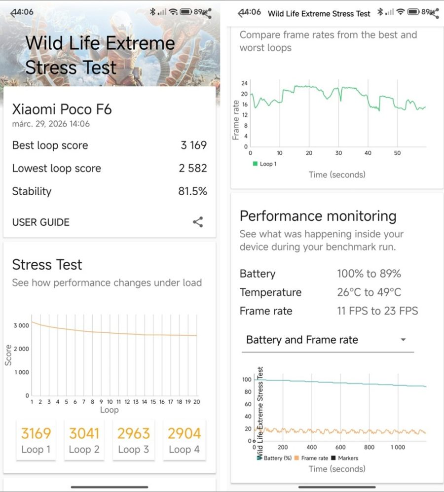 Míg a korábbi Poco generációk hajlamosak voltak túlhevülés miatt megszakítani a mérést, az F6 magabiztosan, hiba nélkül teljesítette a feladatot. Ez komoly előrelépés: a throttling (teljesítmény-visszafogás) mértéke minimális, így a játékosok hosszú távon is egyenletes teljesítményre számíthatnak.