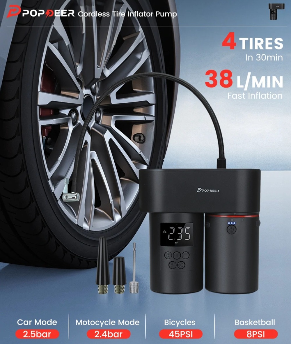 A Popdeer PD-E Pro vezeték nélküli pumpája percenként 38 liter levegő szállítására képes, a csomagban öt különböző adapter található, amelyek lehetővé teszik a használatát személyautók, kerékpárok és motorkerékpárok gumiabroncsainak felfújásához. A készülék rendelkezik egy kis, de jól látható digitális kijelzővel, amelyen a felhasználó nyomon követheti a felfújás aktuális nyomását és a folyamat előrehaladását. Lehetőség van egyéni nyomásértékek beállítására is, de a gyártó előre beállított értékeket is kínál a leggyakoribb felhasználási területekre, például 2,5 bar-t ajánl személyautókhoz, 2,4 bar-t motorkerékpárokhoz, 45 Psi-t kerékpárokhoz és 8 Psi-t labdákhoz. A kompresszor egy rendkívül praktikus funkcióval is rendelkezik: automatikusan leáll, amint eléri a beállított nyomásértéket, így a felhasználónak nem kell aggódnia a túlfújás veszélye miatt. A készülékbe egy kis LED lámpa is beépítésre került, amely sötétben vagy rossz látási viszonyok között segítséget a gumiabroncs szelepének megtalálásában és a felfújás elvégzésében.