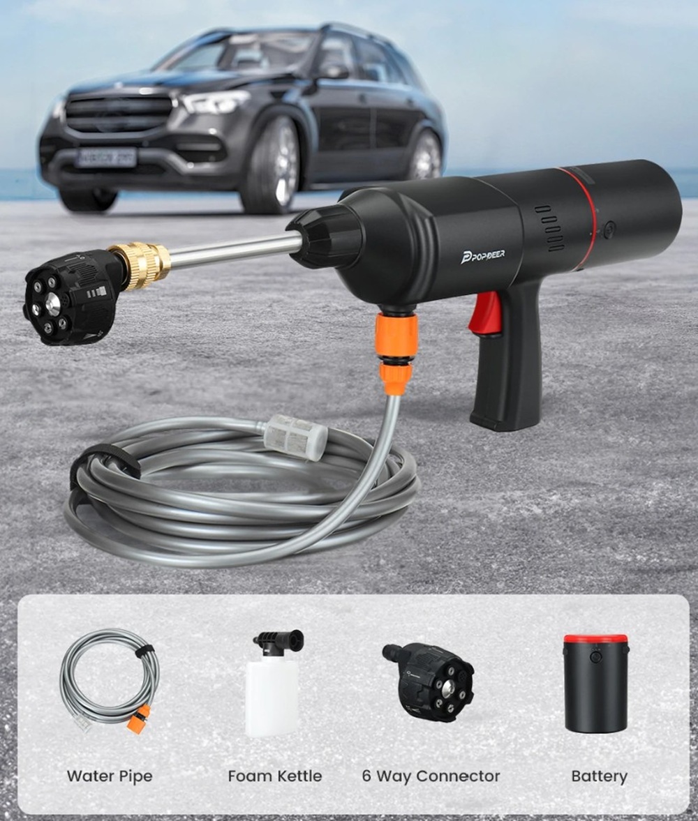 A csomag tartalmaz egy szórófejet, amely hat különböző szórási mintázatot kínál. A mosópisztolyhoz tartozik egy kis méretű tisztítószer-tartály is, amely elegendő egy nagyobb személyautó teljes lemosásához.