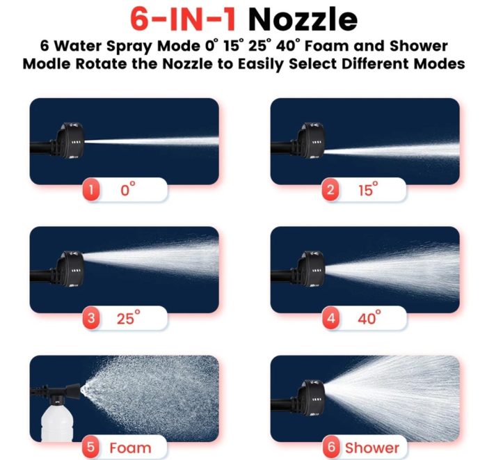 A készülék egyik kiemelkedő tulajdonsága a hat az egyben multifunkciós fúvóka. Ez a fúvóka egyszerű elforgatással lehetővé teszi a különböző szórásképek közötti váltást, így nincs szükség a fúvókák cseréjére a különböző tisztítási feladatokhoz. Az elérhető opciók széles skálát fednek le: