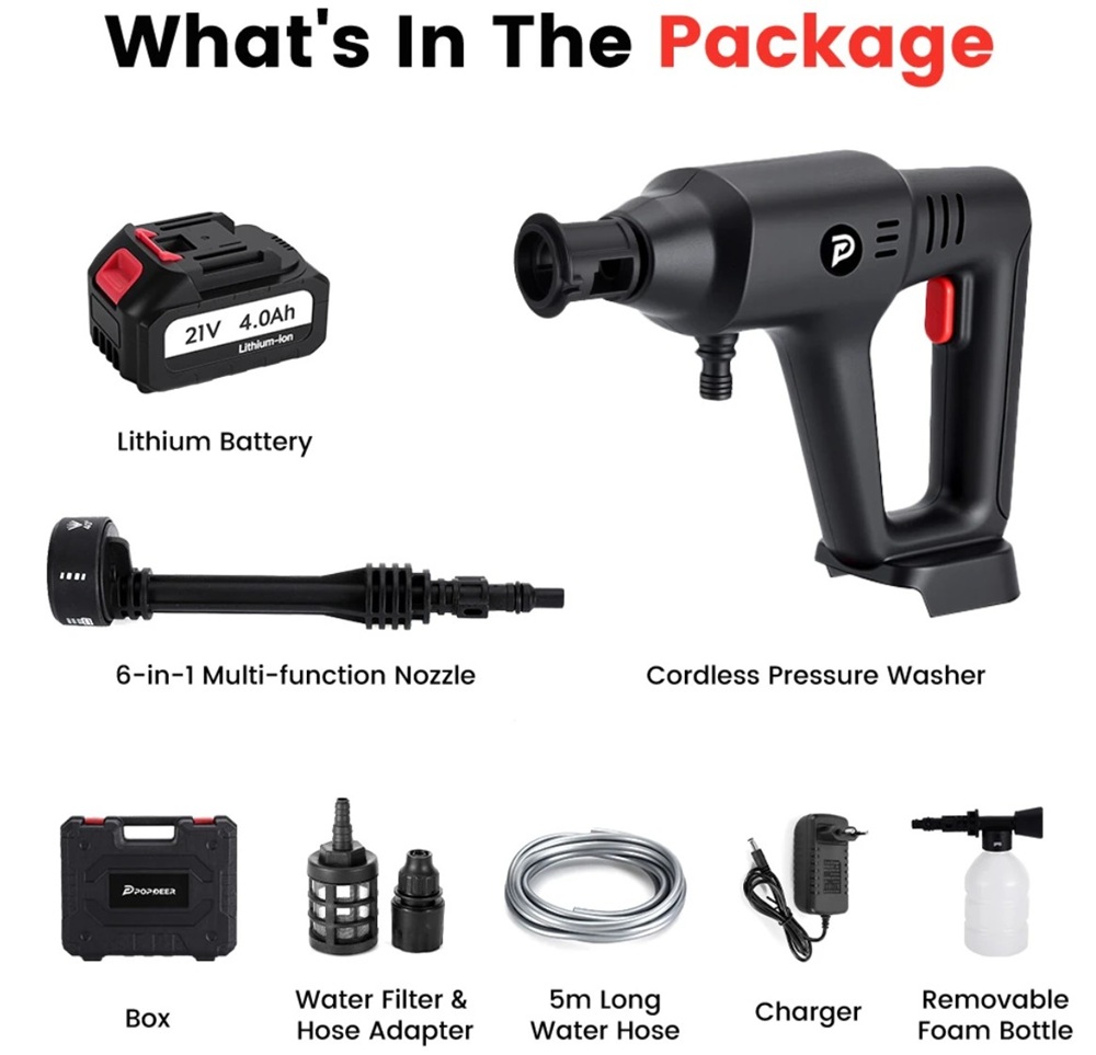 A teljes szett praktikus hordtáskában érkezik, minden szükséges kiegészítővel: vízszívó tömlő szűrővel, habosító tartály, akkumulátor, töltő és persze maga a mosópisztoly. Nincs szükség külön szerszámra vagy plusz alkatrészre a használathoz, minden benne van a csomagban, amire szükség lehet.