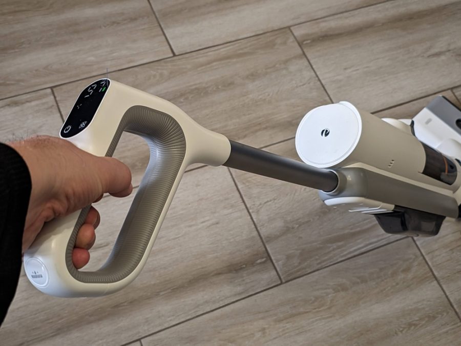 Az ergonómia egyik kulcseleme a „D” alakú markolat, amely természetes kéztartást biztosít, és hosszabb takarítás során sem válik kényelmetlenné. A fő kezelőszervek – bekapcsolás, üzemmódváltás, öntisztítás – mind hüvelykujjal elérhetők, így a gép használata intuitív, folyamatos figyelmet nem igényel.
