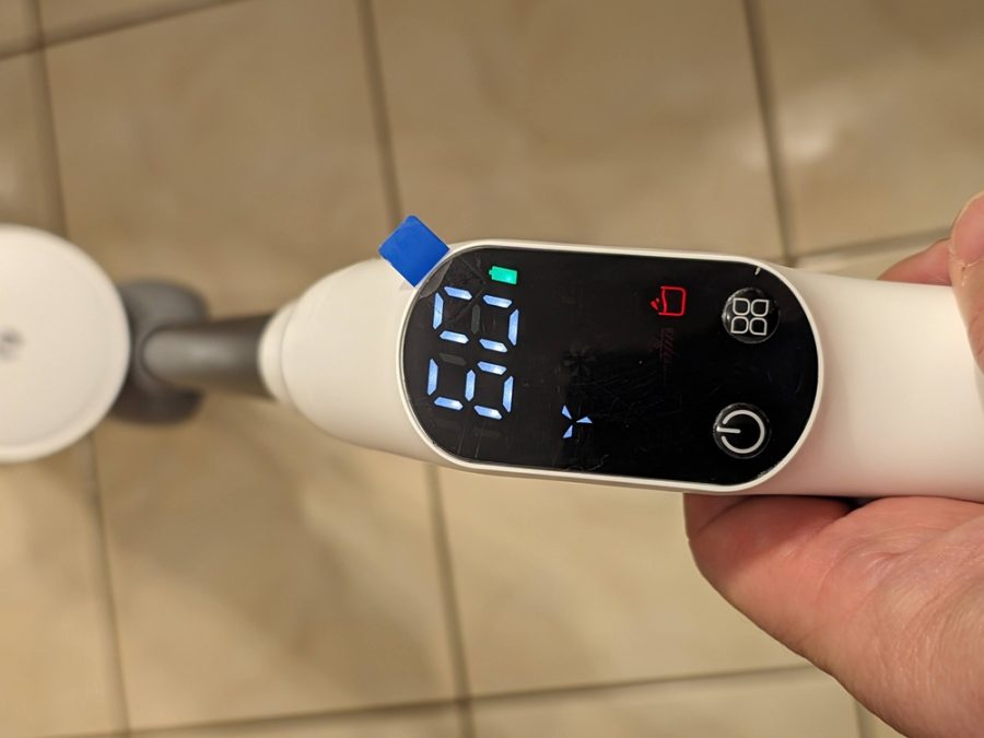A géptest elején egy nagyméretű LED-kijelző található, amely bár nem prémium OLED panel, funkcionalitás szempontjából kifogástalanul teljesít. Nagy, jól olvasható számokkal mutatja az akkumulátor töltöttségét, jelzi az aktuális üzemmódot, és egyértelmű ikonokkal figyelmeztet a legfontosabb állapotokra, például a kifogyott tiszta vízre, a megtelt szennyvíztartályra vagy az elakadt kefére.