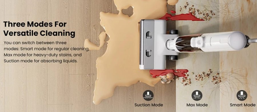 Az F10 Ultra három üzemmódot kínál. A Smart mód az alapértelmezett beállítás, amelyben a szenzorok a szennyezettség mértékéhez igazítják a szívóerőt és a vízadagolást. A Max mód minden tartalékot mozgósít a makacs, rászáradt szennyeződések eltávolításához, míg a Suction mód a vízadagolás kikapcsolásával kizárólag a folyadékok felszívására koncentrál, például konyhai kiömlések esetén.