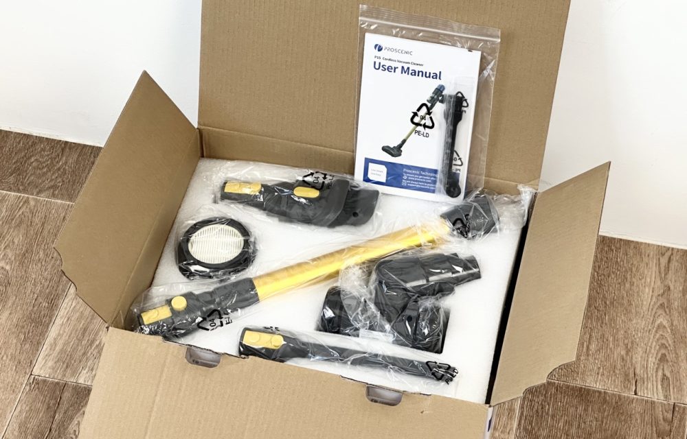 A Proscenic P15 egy nem túl nagy méretű dobozban érkezett, kiválóan becsomagolva, minden egyes tartozék külön elhelyezve, szivaccsal védve.