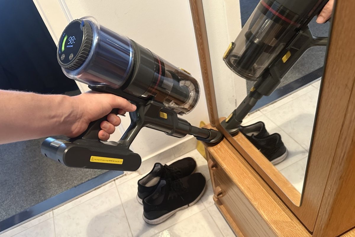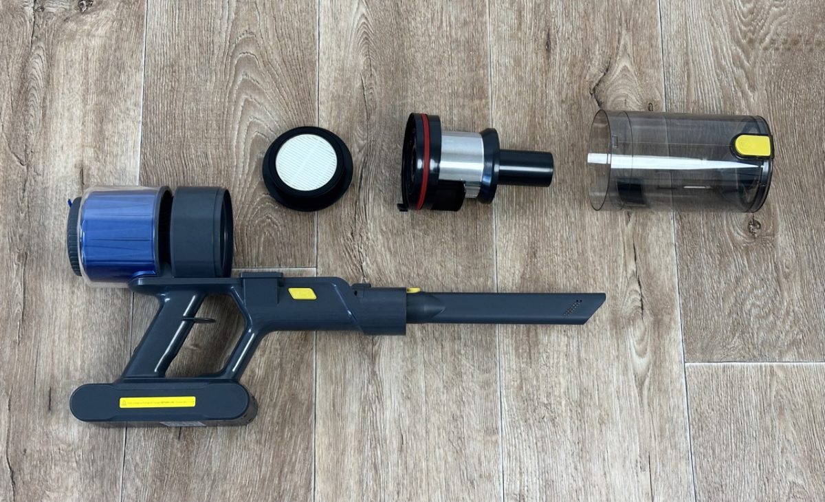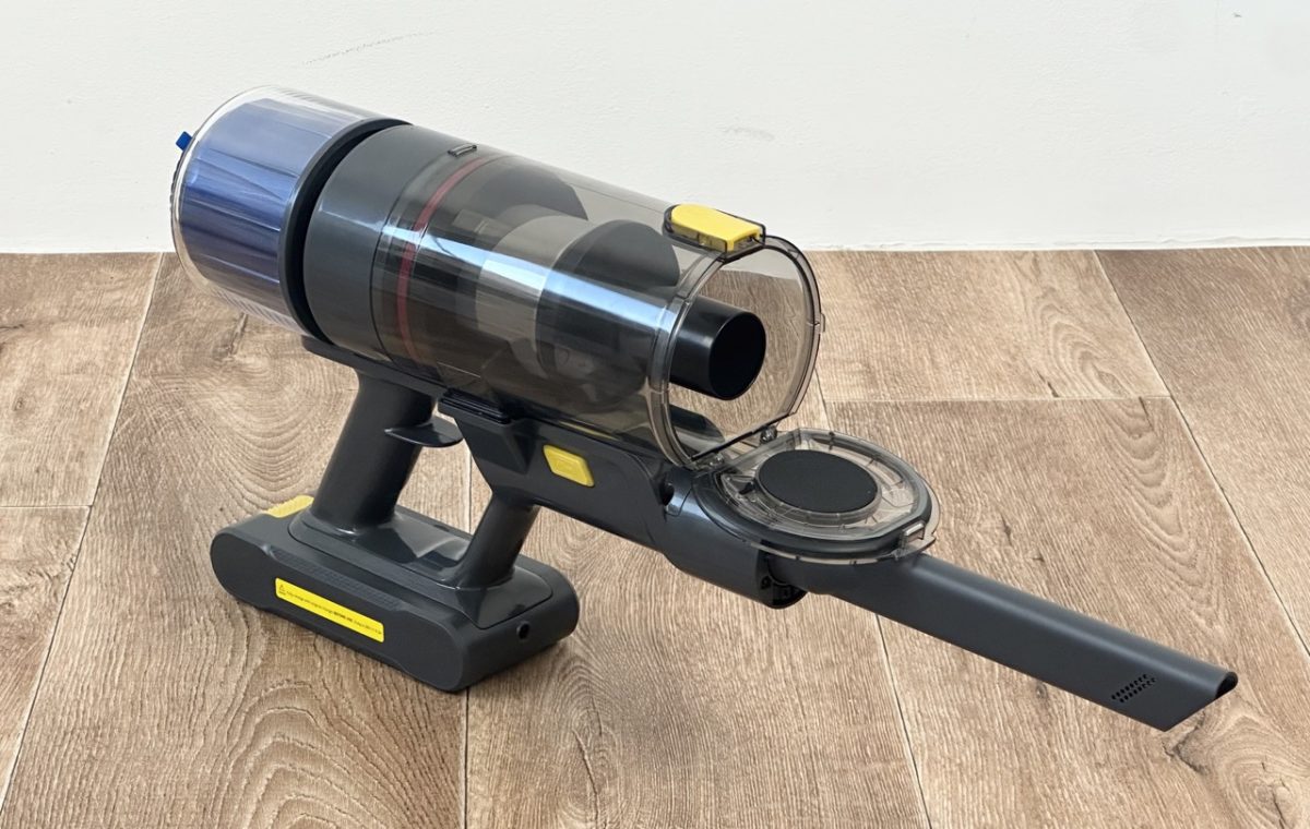 Az 580 W-os motor hátul, az akkumulátor pedig alul található, utóbbi könnyen cserélhető, és külön is lehet tölteni, ami nagy pozitívum. A kifejezetten méretes, 1,2 literes és átlátszó portartály fentre került. A fedele egyetlen gombnyomásra nyitható, így könnyű üríteni, de teljesen szétszedni sem bonyolult, és akkor jobban ki lehet tisztítani a szűrőkkel együtt.