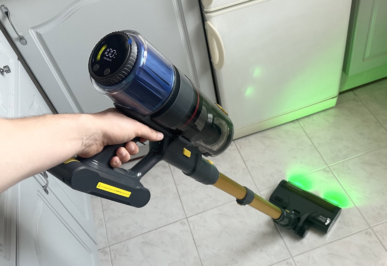 Az 580 W-os motor hátul, az akkumulátor pedig alul található, utóbbi könnyen cserélhető, és külön is lehet tölteni, ami nagy pozitívum. A kifejezetten méretes, 1,2 literes és átlátszó portartály fentre került. A fedele egyetlen gombnyomásra nyitható, így könnyű üríteni, de teljesen szétszedni sem bonyolult, és akkor jobban ki lehet tisztítani a szűrőkkel együtt.