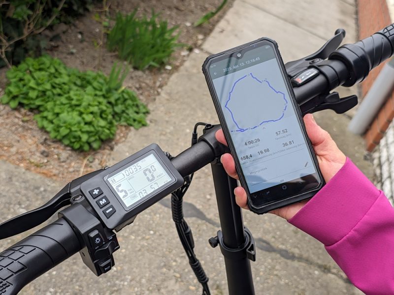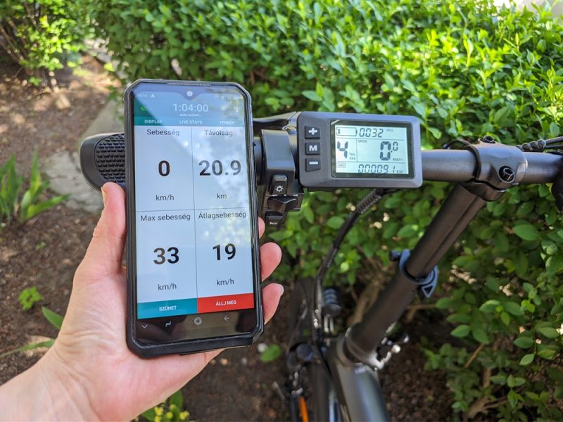 A második szakaszban ugyanezekkel a feltételekkel, ellenszél nélkül, 21 km-t tettünk meg, ugyanazzal az átlagsebességgel és a legnagyobb sebesség 33,36 km/h volt. Összesen 78,5 km-et tekertünk, a kijelzőn már csak egy csík maradt, az akkumulátor feszültsége pedig 32 voltra, azaz 18%-ra csökkent. A közel 80 km-es hatótáv azért magáért beszél.