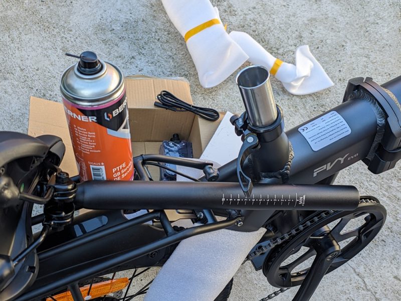 A pedálokat és az ülést kell rögzíteni egy kis zsír kíséretében – az utóbbi kapott egy alumínium betétet, ami hasznos újdonság -, valamint az első lámpa elektromos vezetékét kell csatlakoztatni. A csomagtartó és a sárvédők már gyárilag felszerelésre kerültek. A kerekek felpumpálása 3,5 bar-ig, valamint a vázban lévő akkumulátor feltöltése után a gép használatra kész.