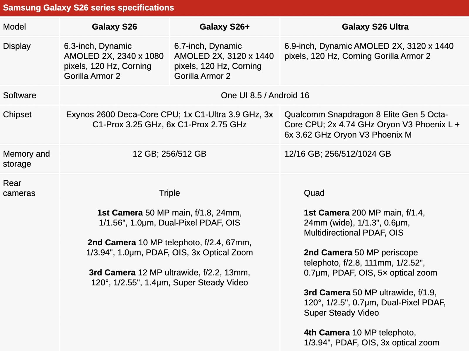 Ahogy az várható volt, Európában a Galaxy S26 és az S26+ modelleket az Exynos 2600 hajtja, ami egy 10 magos processzort jelent 3,9 GHz-es maximális órajellel. Ezzel szemben a Galaxy S26 Ultra belsejébe Snapdragon 8 Elite Gen 5-öt szerelnek, 8 CPU maggal és akár 4,74 GHz-es órajellel. A szoftver egyaránt Android 16-ra épülő One UI 8.5.