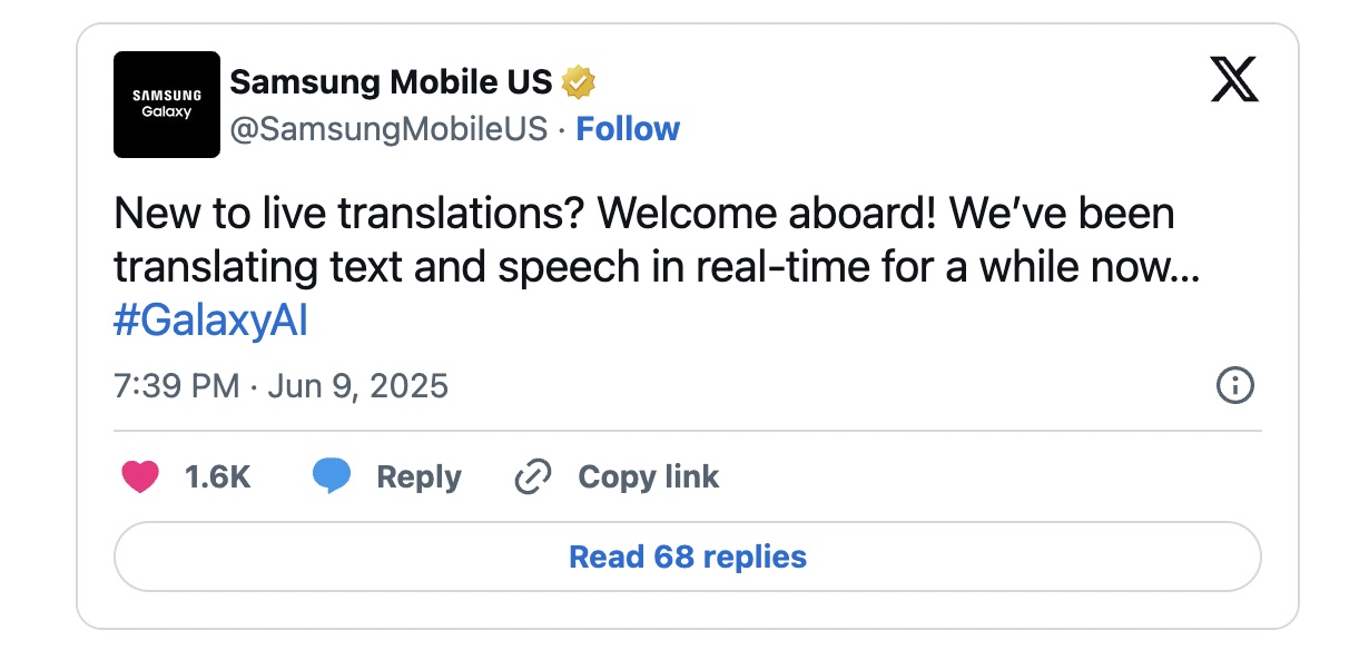Az Apple bejelentette a “Live translate” funkciót is, ami valós időben fordítja például a telefonbeszélgetéseket. A Samsung viszont kiemeli, hogy ezt már hamarabb tudták.