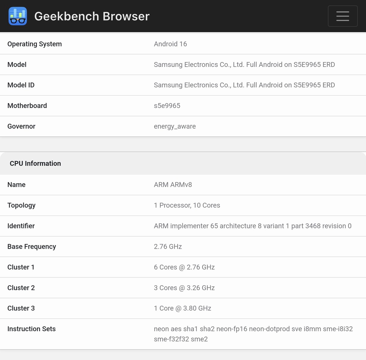 Az Exynos 2600 harcba szólít egy 3,80 GHz-es elsődleges, három 3,26 GHz-en pörgő nagyteljesítményű, valamint hat darab, 2,76 GHz-re konfigurált energiahatékony számítóegységet. Míg az elmúlt néhány generációban az Exynos chipek jellemzően lemaradtak a Qualcomm rivális megoldásai mögött, a jelek szerint az Exynos 2600 méltó kihívó lehet. Bár az eggyel ezelőtti Geekbench eredmény lelombozó volt, most nagyon úgy fest, hogy a Samsung soron következő csúcskategóriás chipsetje mégiscsak felveheti a versenyt a konkurenciával.
