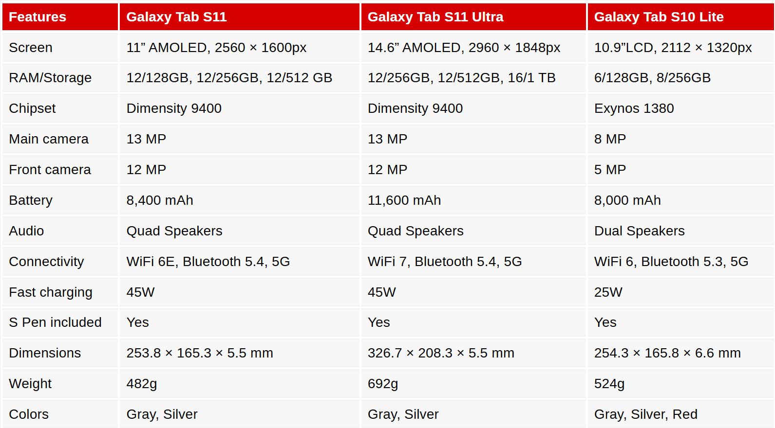 A készülék támogatja a Wi-Fi 6-ot és a Bluetooth 5.3-at, méretei 254,3 x 165,8 x 6,6 mm-esek lesznek, a súlya pedig 524 gramm. A Galaxy Tab S10 Lite szürke, ezüst és piros festéssel kerül forgalomba, 6/128 és 8/256 GB-os kiszerelésekben. Mindhárom táblagéphez csomagolni fognak egy S Pent.
