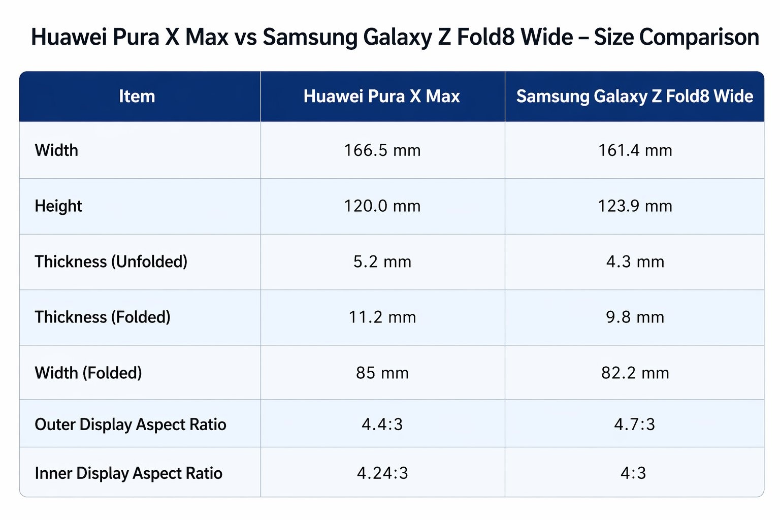 Az okostelefon 4:3-as képarányú belső kijelzővel lesz felszerelve, ami azért is klassz, mert kinyitva azonnal táblagép módba léphetünk anélkül, hogy el kellene forgatni azt. A külső képernyő eközben 4,7:3-as képarányt kap, ami jóval szélesebbé teszi a jelenlegi Galaxy Z Fold 7-nél. A kiszivárgott adatok szerint a Galaxy Z Fold 8 Wide kinyitva 161,4 x 123,9 x 4,3 mm-es, míg összecsukva 161,4 x 82,2 x 9,8 mm-es méretekkel bír.