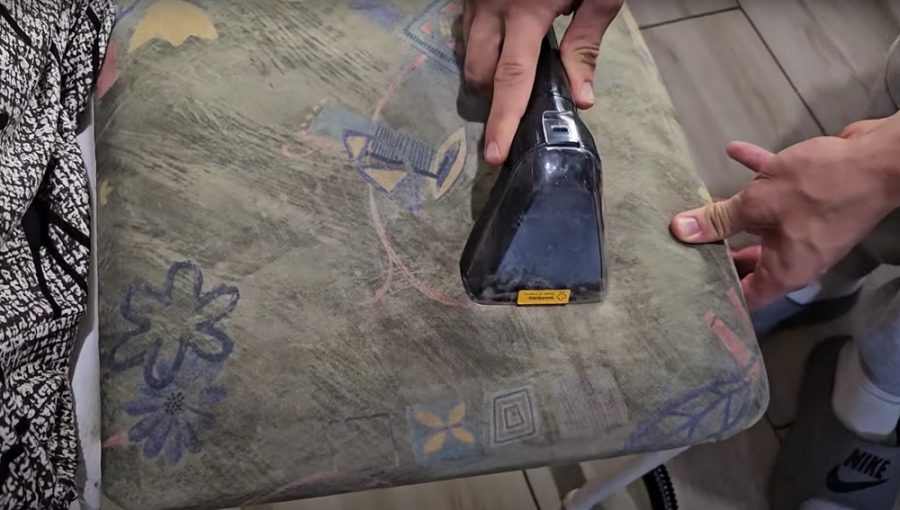 Eredményelemzés: A végeredmény egy teljesen foltmentes kárpit volt. A csokoládé és a ketchup, mint rendkívül nehéz, összetett folttípusok (zsír + pigment + cukor), nem hagytak nyomot maguk után. A szék felülete alig maradt nedves a gyors és hatékony extrakciónak köszönhetően, ami a tiszta felületen túl gyors száradási időt is garantált.
