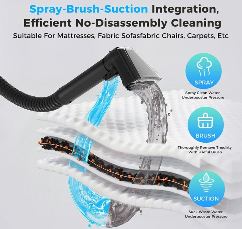 A 12 000 Pa szívóteljesítmény rendkívül magas érték egy hordozható folttisztító esetében. Ez a képesség biztosítja, hogy a gőz és a súrolás által fellazított szennyezett vizet a gép ne csak felszívja, hanem azonnal és teljesen eltávolítsa. Az „azonnali eredmények” garantálása kritikus fontosságú a kárpittisztításban, mert minimalizálja a maradék nedvesség kockázatát.