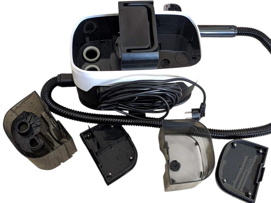 A készülék ergonómiája a nagyméretű tisztítási feladatokat hivatott támogatni. A készülék alján elhelyezett négy görgős kerék különösen praktikussá teszi a főegység mozgatását a szobák között, megkönnyítve a manőverezést, miközben a felhasználó a tömlőt használja.