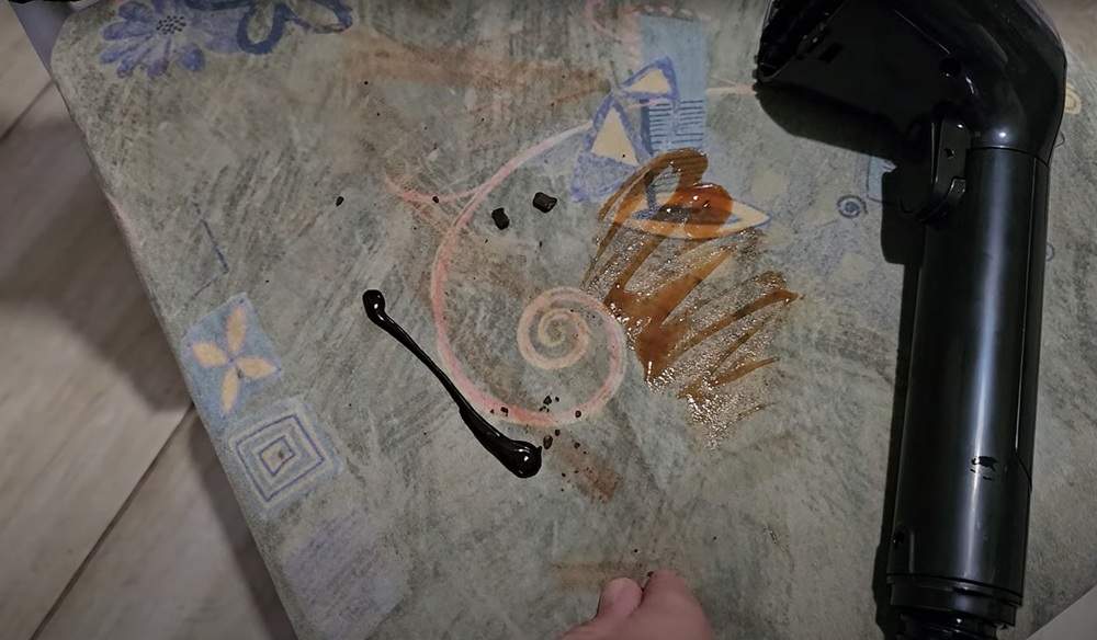 A tisztítást három fázisban végeztük a vasalókefe fejével. Először a célzott gőzadagolással kezdtünk: Mi a fókuszált fúvókát közvetlenül a szennyeződésre irányítottuk. Megfigyelhető volt, ahogy a 110 °C-os gőz hatására a sűrű ketchup és a zsírban gazdag csokoládé gyorsan fellazult és emulgeálódott. Ez a hőkezelés volt az, amely lehetővé tette, hogy a folt könnyen leváljon a rostokról. Fontos azonban, hogy minden gőzzel történő tisztítás előtt végezzünk színpróbát egy rejtett részen, mivel a magas hőmérsékletű gőz egyes kárpitok esetében elszíneződést vagy visszafordíthatatlan károsodást okozhat. Ezután a fúvókán lévő kefe segítségével finom, mechanikai súrolást végeztünk, hogy a fellazult szennyeződést mélyebben kimozdítsuk. Végül a C6 MAX 12 000 Pa-os szívóerejének aktiválásával azonnal megkezdődött a szennyezett, forró lé eltávolítása. A készülék gyorsan felszívta a piszkos vizet, elhárítva ezzel a szék átnedvesedésének kockázatát.
