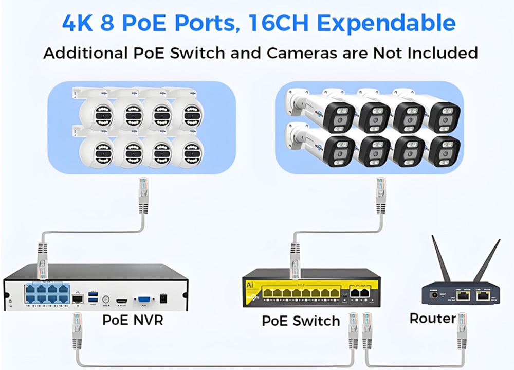 A PoE technológia az egyik legnagyobb előnye a rendszernek: a kamerák egyetlen UTP kábelen keresztül kapják az áramot és továbbítják a videójelet az NVR felé. Nincs szükség külön tápkábelezésre, ami gyorsabb, tisztább és stabilabb telepítést eredményez a vezeték nélküli megoldásokhoz képest.