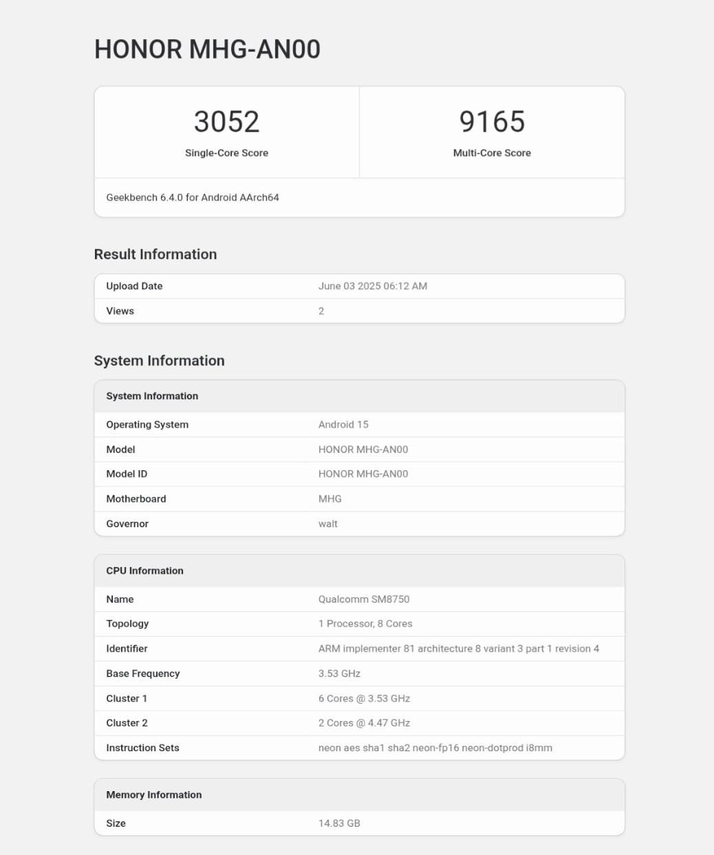 A Honor Magic V5 az MHG-AN00 modellszámmal tűnt fel a Geekbench adatbázisában. A szintetikus tesztalkalmazás megerősítette, hogy a készülék Snapdragon 8 Elite lapkakészlettel lesz felszerelve, a próbára tett prototípusban 16 GB RAM teljesített szolgálatot. A készülék a mérések során Android 15 operációs rendszert futtatott, vélhetően ezzel a szoftverrel is fog debütálni.