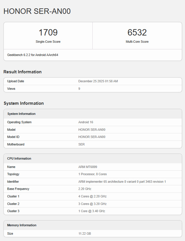 Az MT6899 kódnéven futó lapkakészlet 1709 pontot gurított az egymagos, és 6532 pontot a többmagos mérések során. Tesztelésre egyébként a Geekbench 6-os verzióját használták. A publikált adatlap szerint a CPU-kiépítés áll egyfelől a 3,40 GHz-es elsődleges, valamint három 3,20 GHz-en pörgő nagy teljesítményű számítóegységből. A sort négy 2,20 GHz-en zakatoló energiahatékony mag zárja.