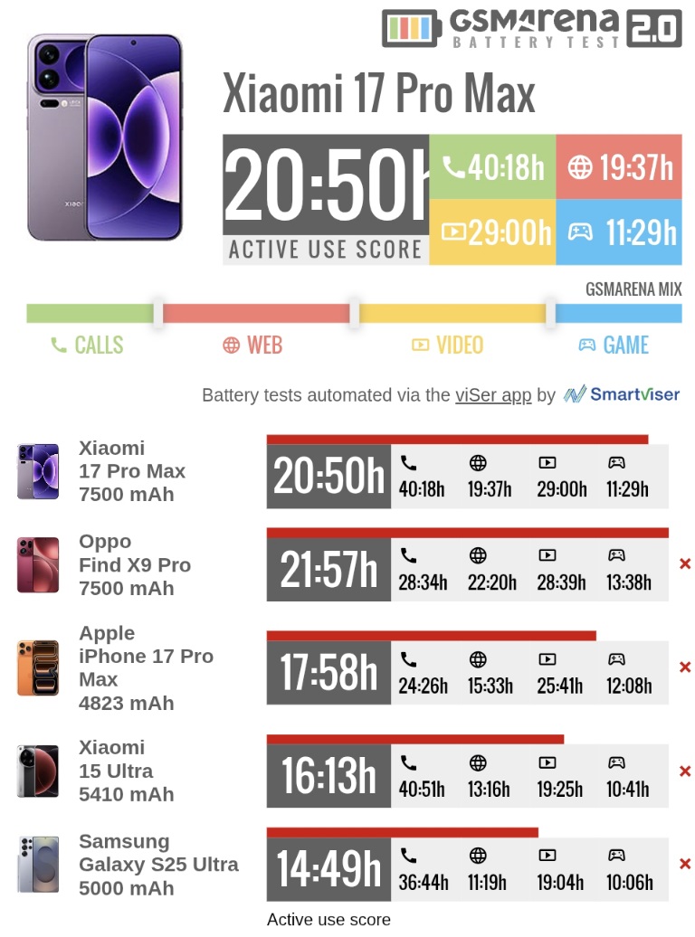 A Xiaomi 17 Pro Max 20 óra 50 perces összesített aktív használati időt ért el a GSMArena tesztjén. Ez az eredmény kiváló, bár némileg elmarad a fő rivális, az azonos méretű, vagyis 7500 mAh-s teleppel szerelt Oppo Find X9 Pro 21 óra 57 percétől. Ennek ellenére a Xiaomi készüléke messze felülmúlja az iPhone 17 Pro Max és Samsung Galaxy S25 Ultra modelleket, az előbbi 17 óra 58 percet, az utóbbi 14 óra 49 percet hozott össze a GSMArena mérései során.