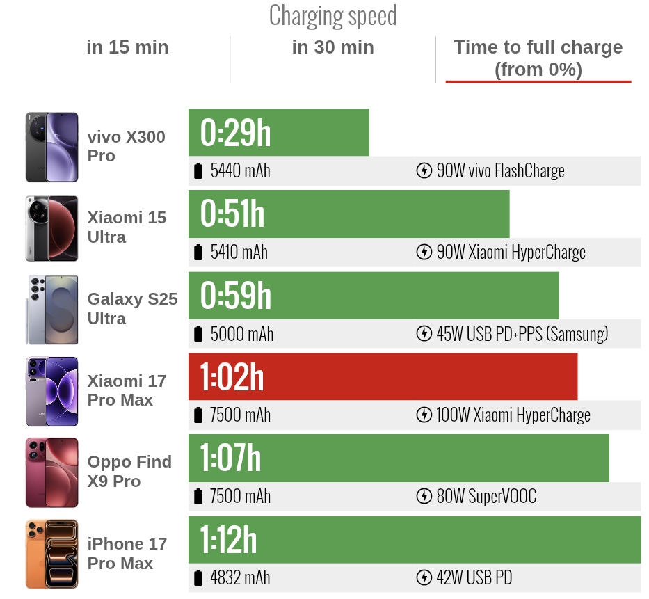 A GSMArena próbára tette a Xiaomi 17 Pro Max akkumulátorát, illetve tesztelte annak töltési sebességét is. A rendkívül méretes, 7500 mAh kapacitású teleppel szerelt okostelefon kifejezetten meggyőző eredményeket produkált, jelentősen megelőzte a Samsung és az Apple aktuális csúcsmodelljét is.