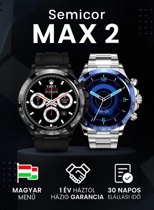 A Semicor Max 2 egy prémium, divatos, masszív kialakítású, fémházas férfi okosóra teljesen magyar menüvel, ami elérhető fekete és ezüst színben egyaránt, fém szíjjal és ajándék második szilikon szíjjal. A kijelzője gyönyörű, és számos hasznos funkciója van: hívások indítása és fogadása (kihangosítva), értesítések jelzése, napi aktivitásmérés, pulzusmérés, sport módok, stb.