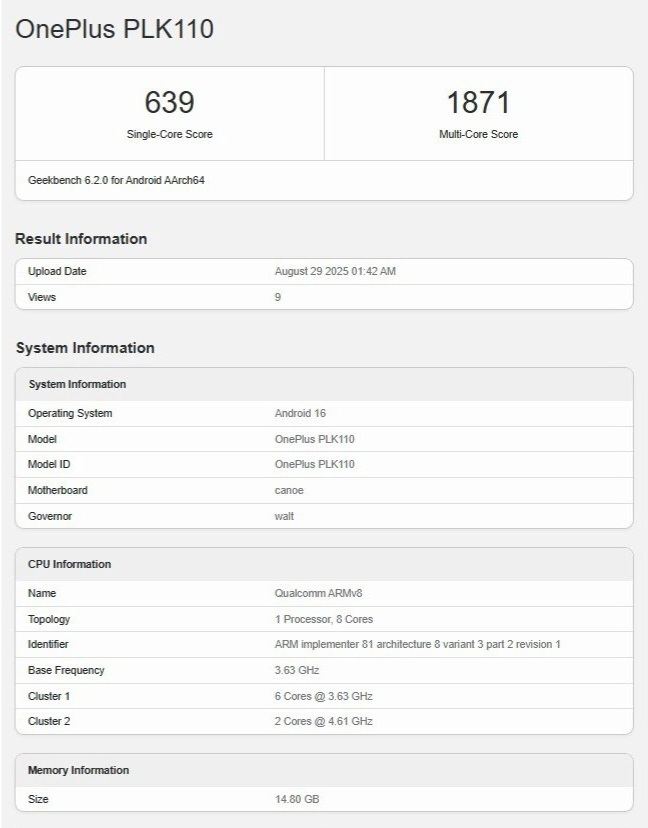 A Geekbench adatbázisában a PLK110 modellszámmal tűnt fel egy készülék, amely szinte biztosan a OnePlus 15. A tesztalkalmazás megerősíti, hogy a belsejében a Snapdragon 8 Elite 2 lapkakészlet zakatol, illetve felfedi annak CPU-kiépítését is. A chipset munkára fog két, 4,61 GHz-en futó elsődleges magot, illetve hat, 3,63 GHz-en pörgő, teljesítményre kiélezett számítóegységet. A próbára tett prototípus nem gurított nagy pontokat, de ez valószínűleg annak tudható be, hogy egy gyártás előtti, korai mintadarabról lehetett szó.